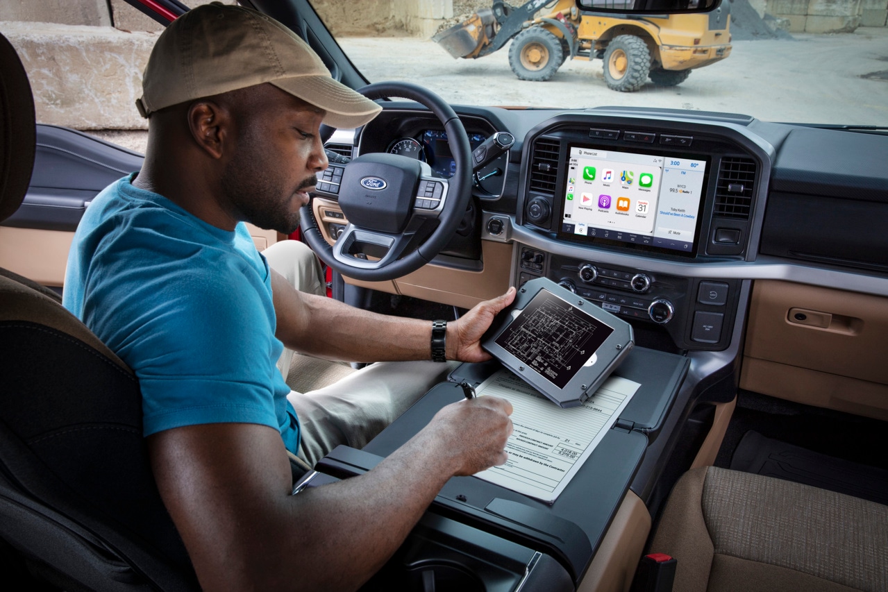 Explore the interior of the 2026 Ford F-150, which blends tough functionality with comfort. It seats up to 6 people, depending on the setup. Choices include tough cloth for work trims or premium leather seats with heating, ventilation, and Active Motion in higher trims. The roomy interior provides plenty of storage, such as a pass-through console and various compartments for gear and personal belongings. Plus, if you're like many Oak Harbor business owners and your truck doubles as your office from time to time, you'll especially appreciate the available work surfaces integrated right into the center console and armrest, perfect for keeping your laptop, notebook, or tablet computer within reach.